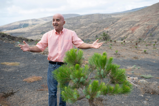 Ya lleva plantados ciento cincuenta y cuatro pinos, y cada cierto tiempo, garrafa en mano, sube a regarlos él mismo, porque hasta allí no llega el agua corriente.